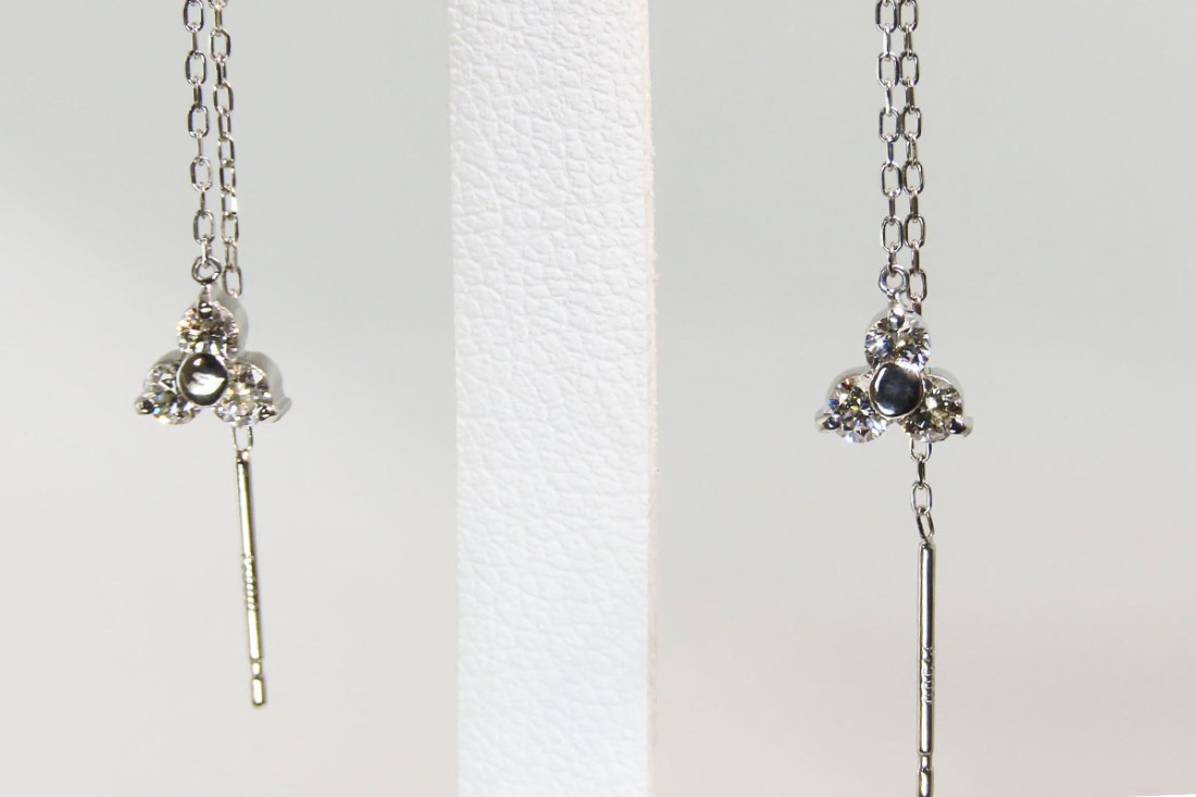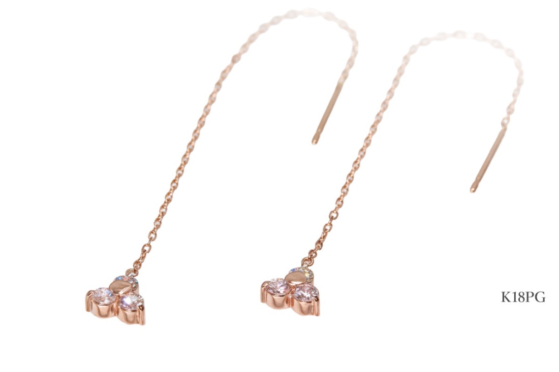 通常のアメリカンピアスよりチェーンを約1cm長く設計することで、動くたびに美しい揺れ感と、ダイヤモンド本来の輝きをより一層引き立てます。