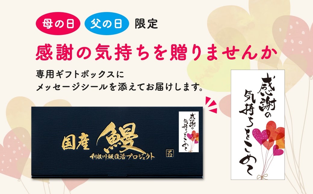 利根川の恵みとともに歩んできた境町の熱い想いが詰まった蒲焼です。温めるだけで専門店の味が食卓に。ふっくらと焼き上がった国産鰻の香ばしさと、秘伝のタレが織りなす至福の味わいを、感謝の言葉と共にぜひ大切な方へお届けください。