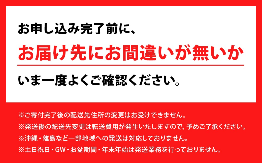 ※転居以外の理由で配送先の変更は承っておりません(配送トラブルを防ぐためご理解ください)。お申し込みの際に配送先をよくご確認ください。