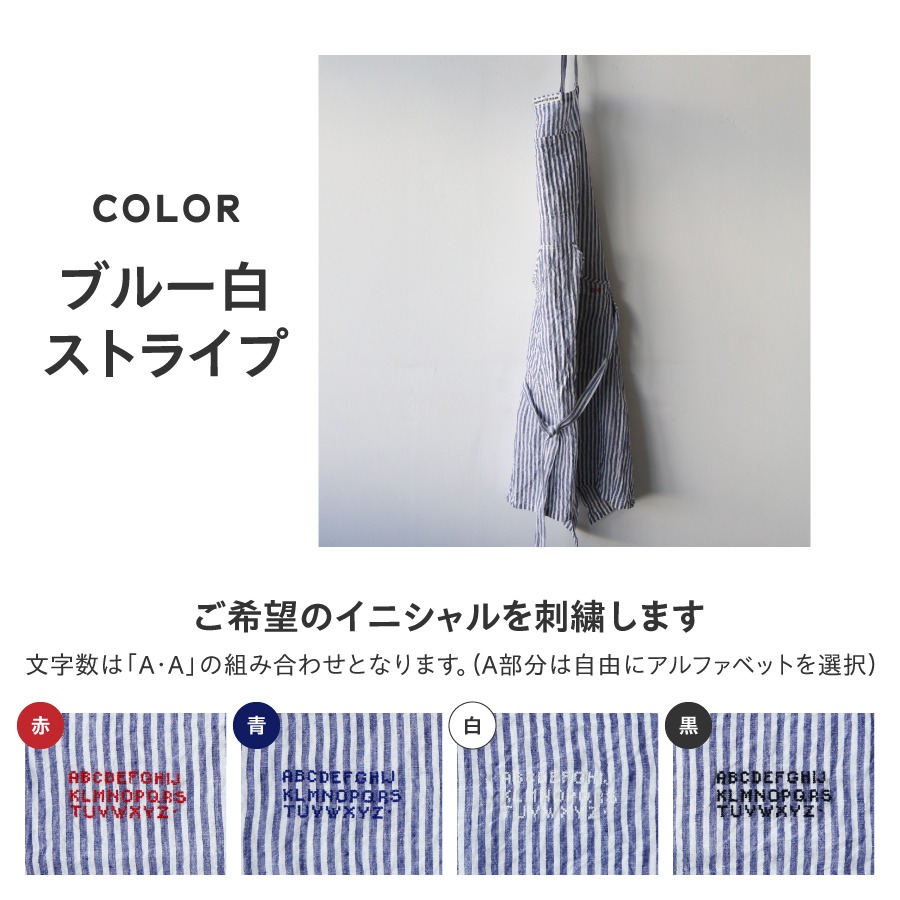 ※エプロンカラー【ブルー】【ブルー白ストライプ】の刺繍カラーは赤・青・白・黒の4色からお選びください。