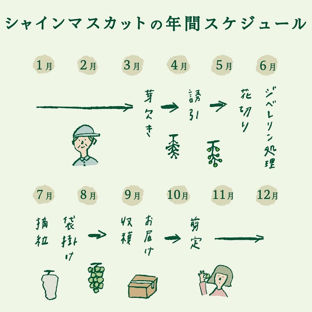 手間をかけ一粒一粒まで精魂込めた厳選されたシャインマスカットを皆様へお届けいたします。